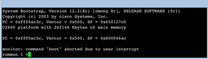 Il existe un mode de maintenance (ROMmon) qui peut servir, notamment, à réinitialiser les mots de passe du routeur. Le shell ressemble à ça :