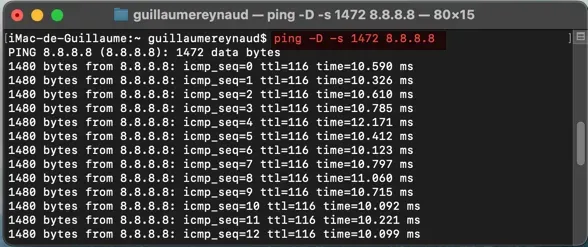 Si le ping réussit, votre chemin supporte un MTU de 1500. En cas d'échec, réduisez progressivement la valeur jusqu'à trouver la taille maximale acceptée.